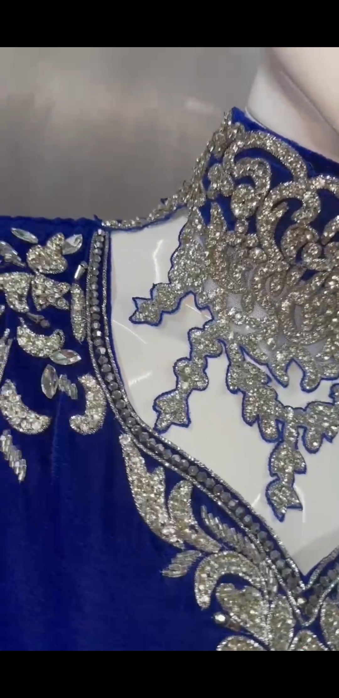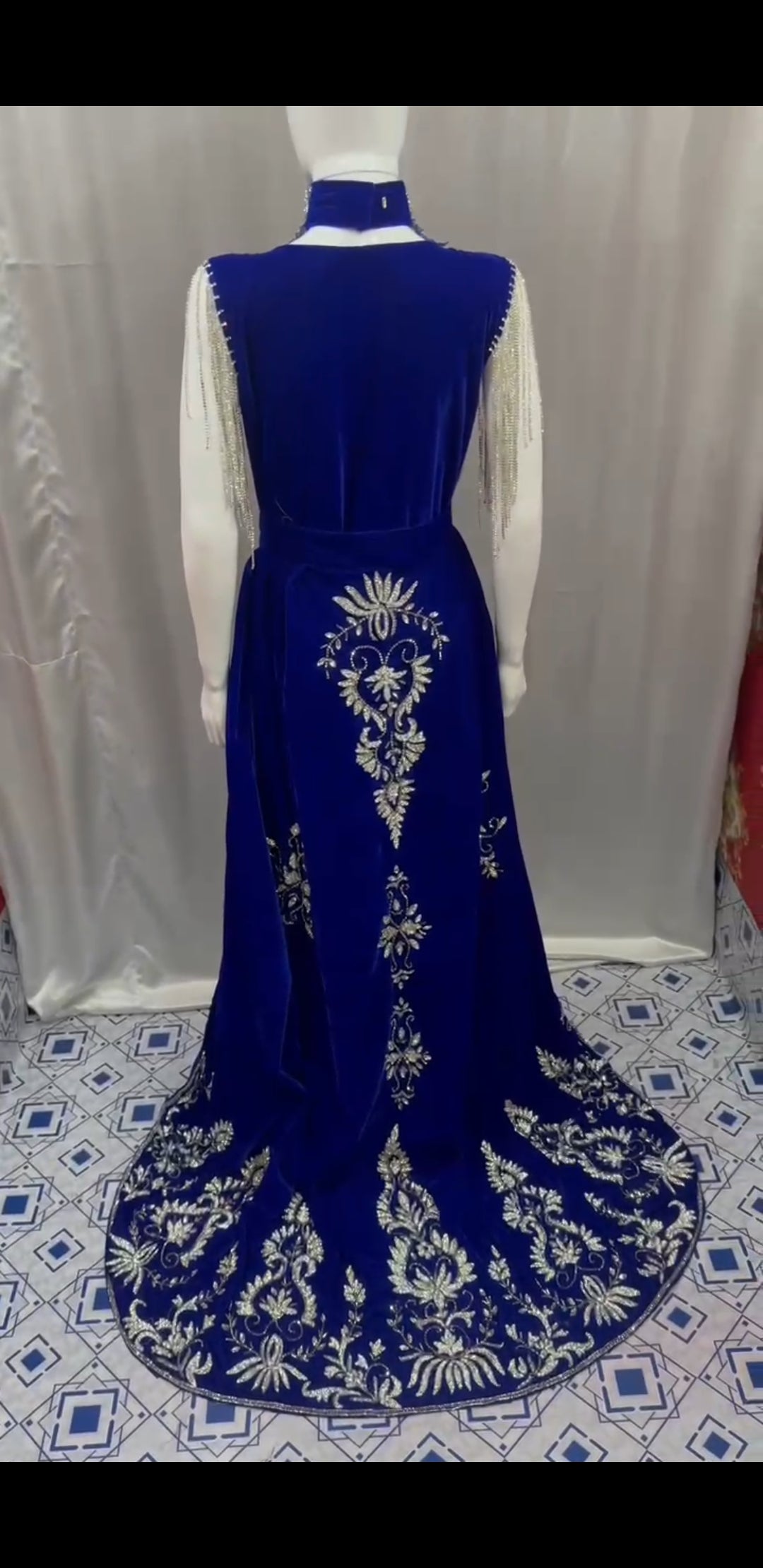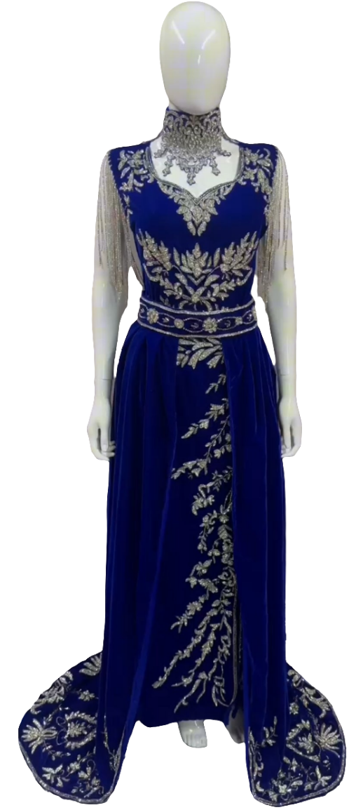 Step into timeless elegance with this royal blue velvet gown, beautifully finished with delicate silver embroidery. Perfect for weddings, feast days, and special occasions, each gown is handmade to order, ensuring every detail is crafted with care.