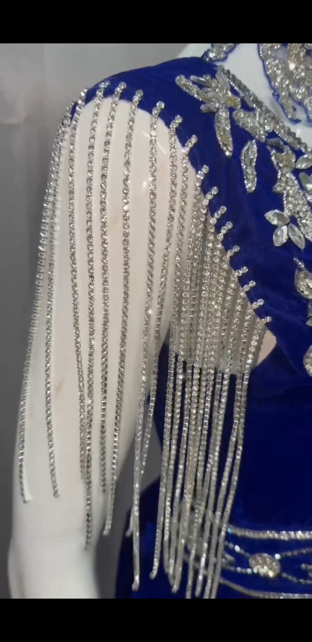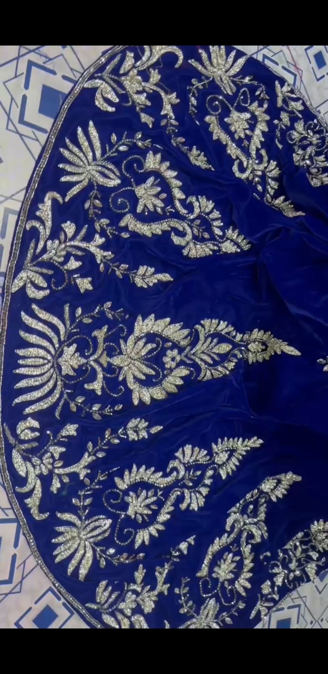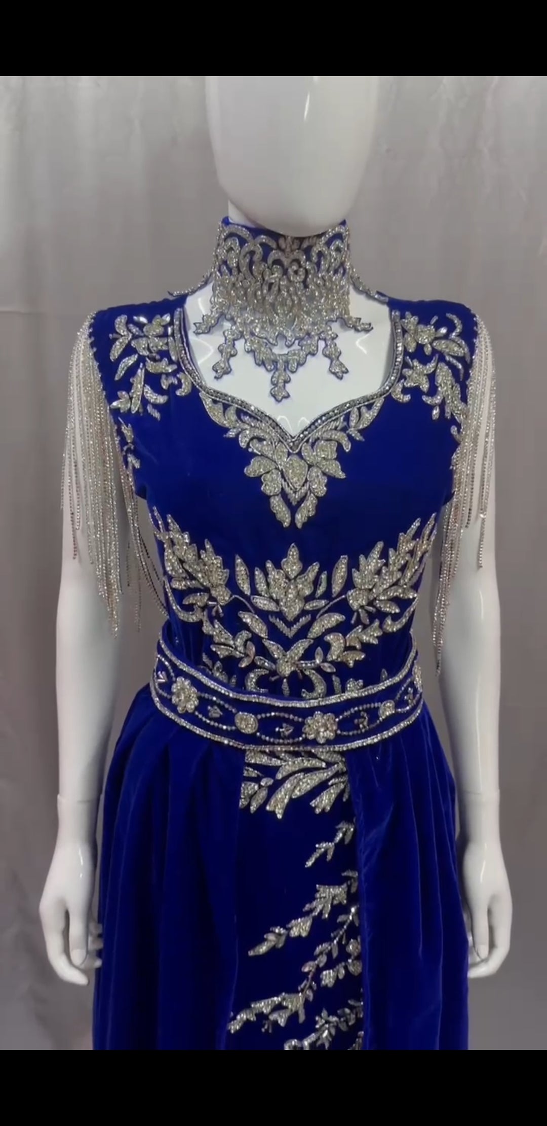 Step into timeless elegance with this royal blue velvet gown, beautifully finished with delicate silver embroidery. Perfect for weddings, feast days, and special occasions, each gown is handmade to order, ensuring every detail is crafted with care.