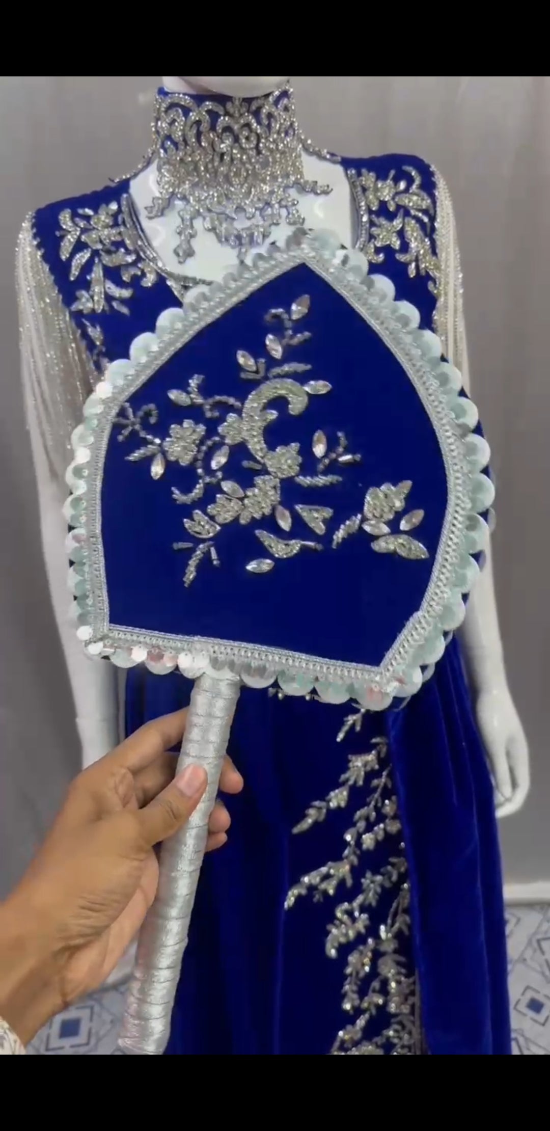 Velvet Gown with Embroidery & Detachable Neck Piece and Hand Fan