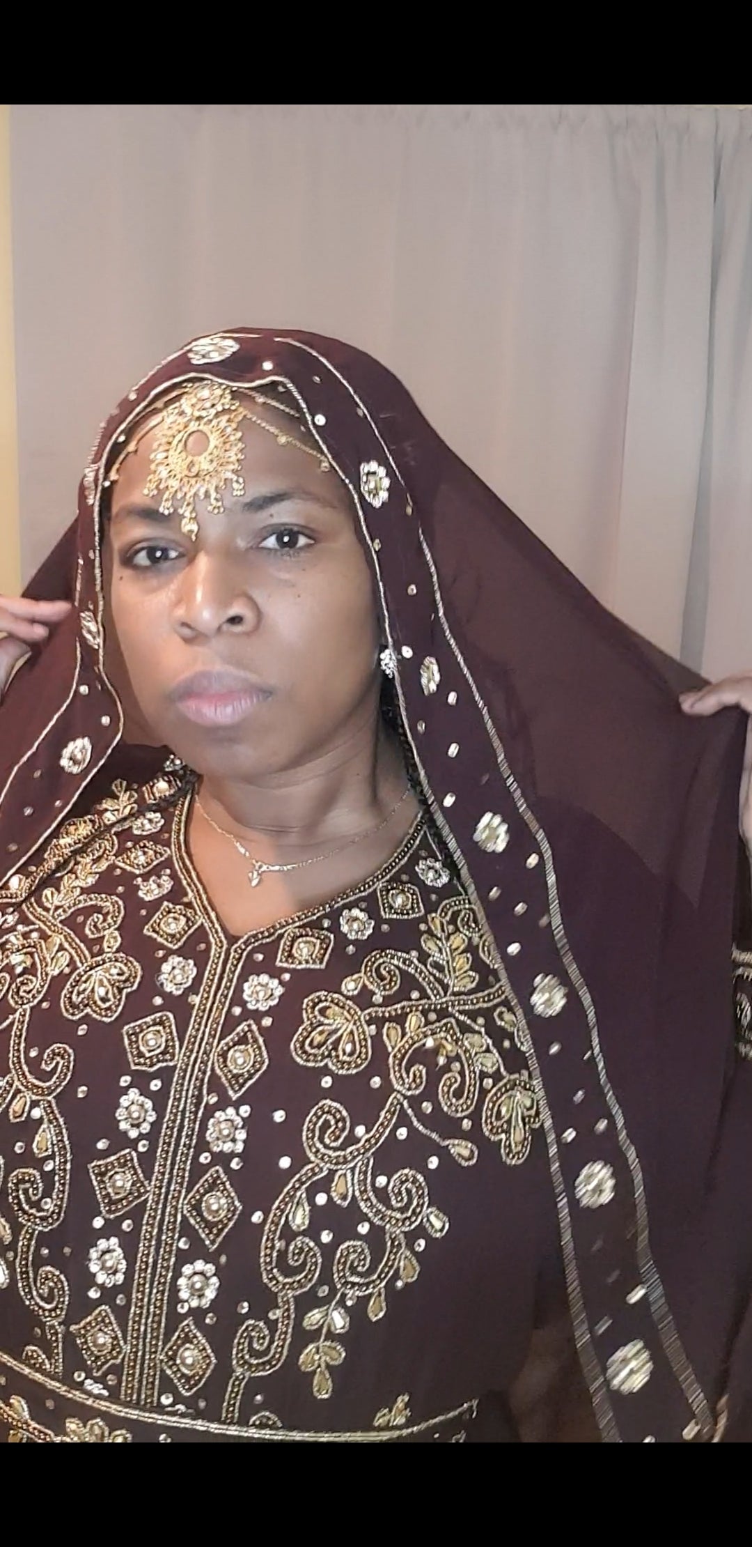 This is Ruth a beautiful gown with champagne gold beading along the front . The sleeves are lined with champagne Gold Crystal and stones .She also comes with a headwrap and a belt .