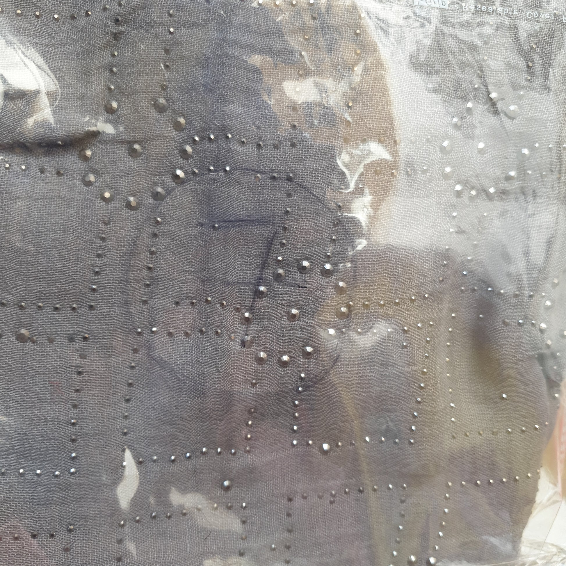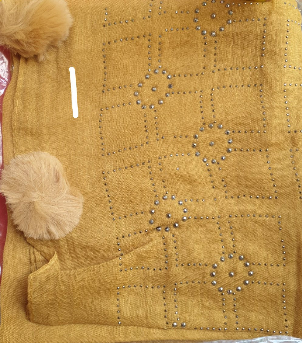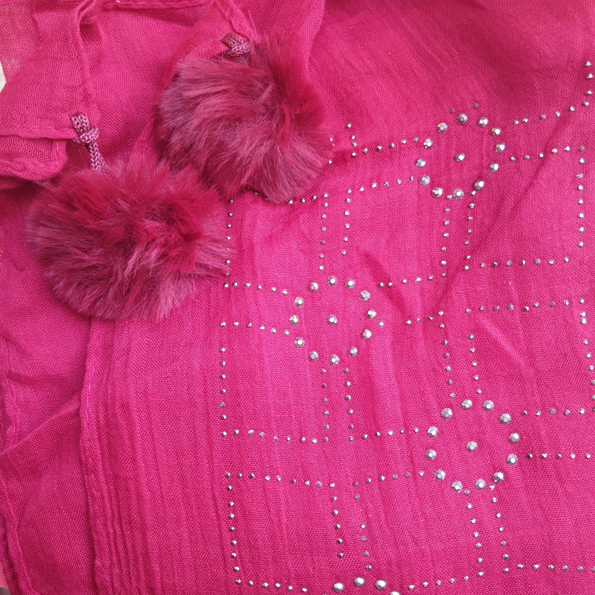 This is a 100% fabric scarf with a rhinestone decoration on one edge also two super cute pompoms.