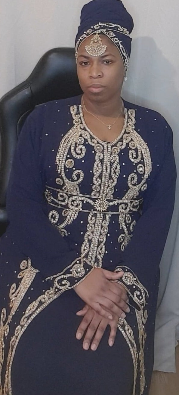 This is Bethany a beautiful gown with champagne & coloured beading along the front . The sleeves are lined with champagne Gold Crystal and stones .She also comes with a headwrap and a belt .