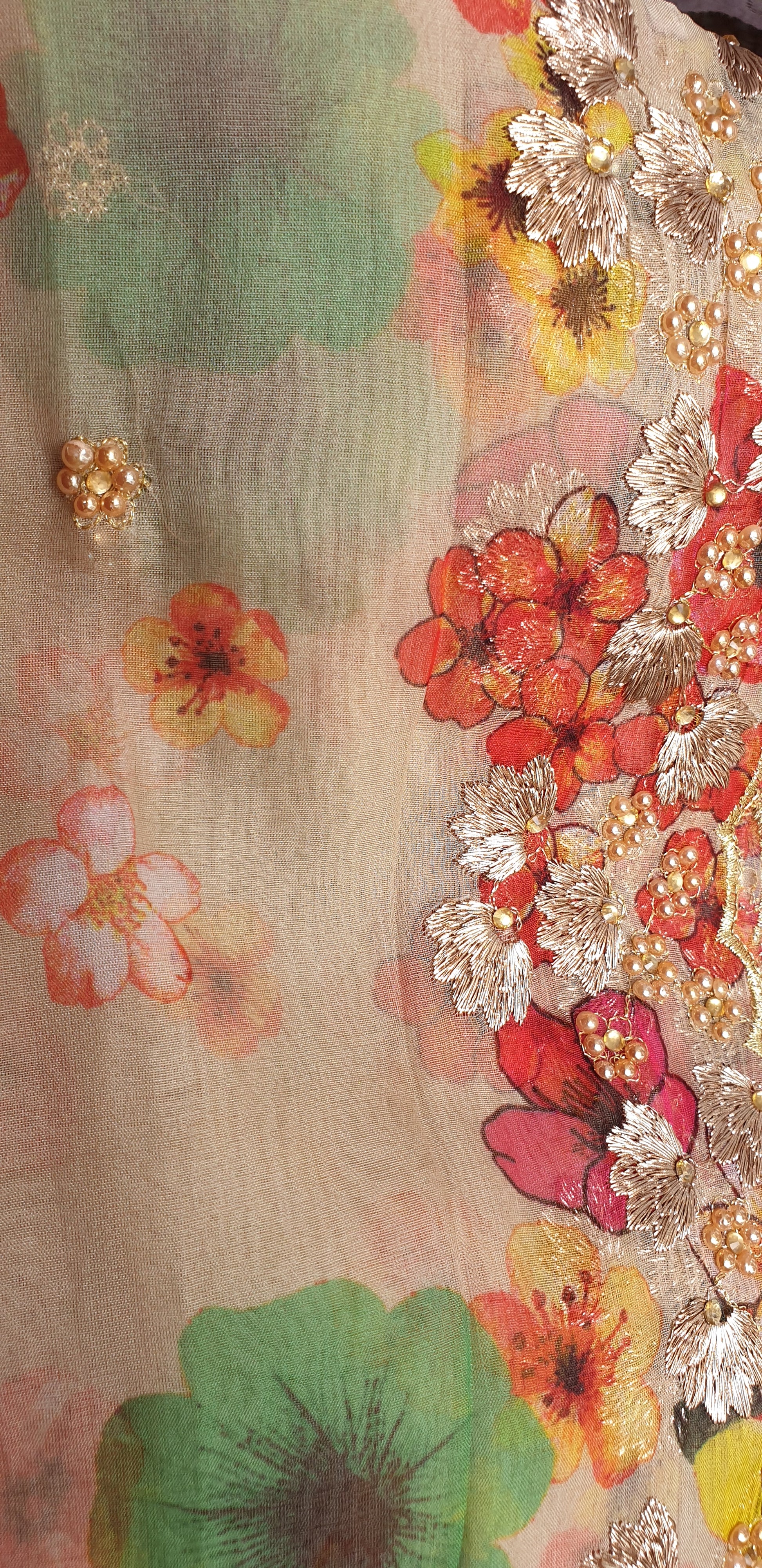This wrap has a beautiful slightly shimmer fabric . This is super light 100% fabric, which has a decorative beaded border on the long edge and golden lace on the shorter edges