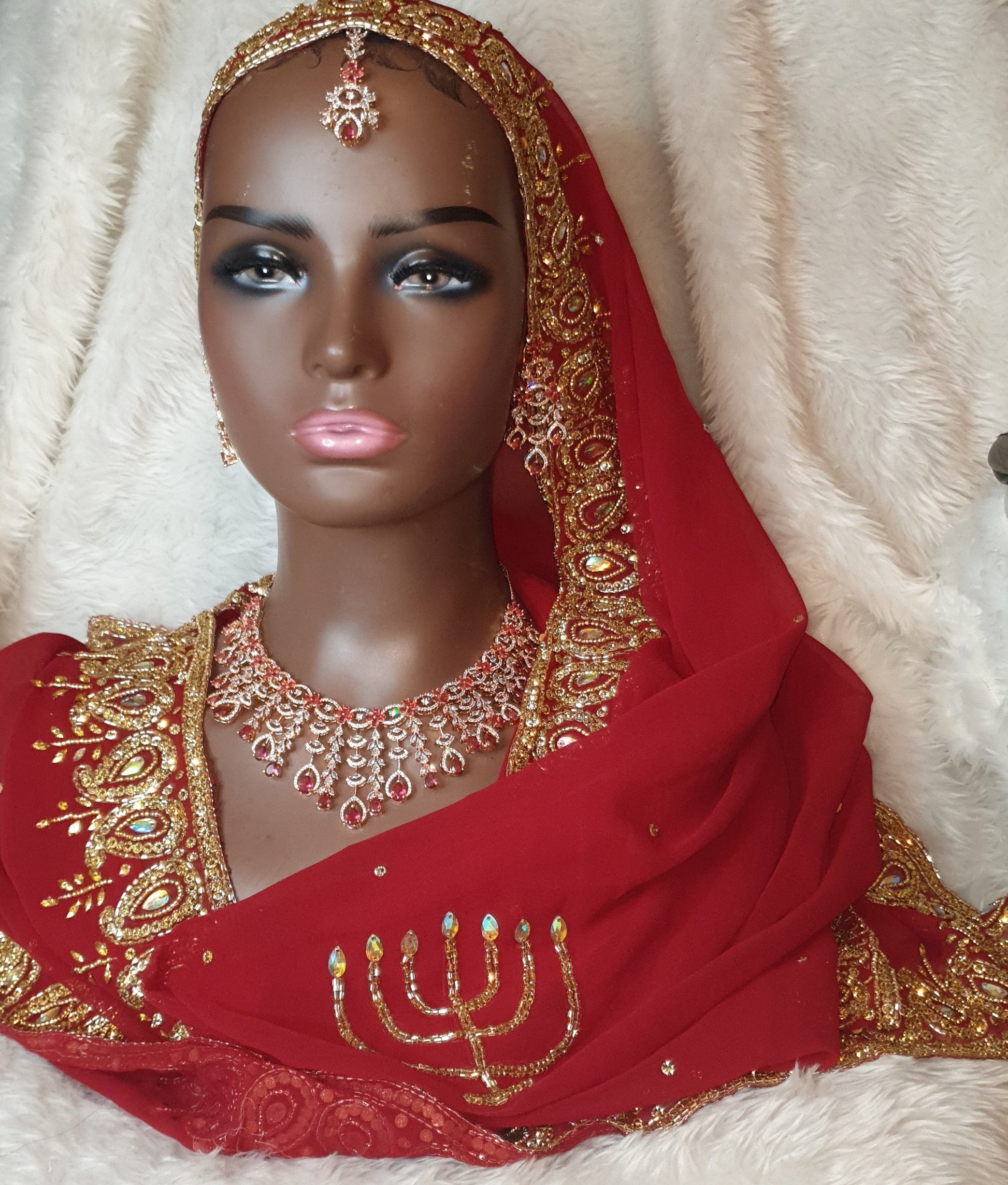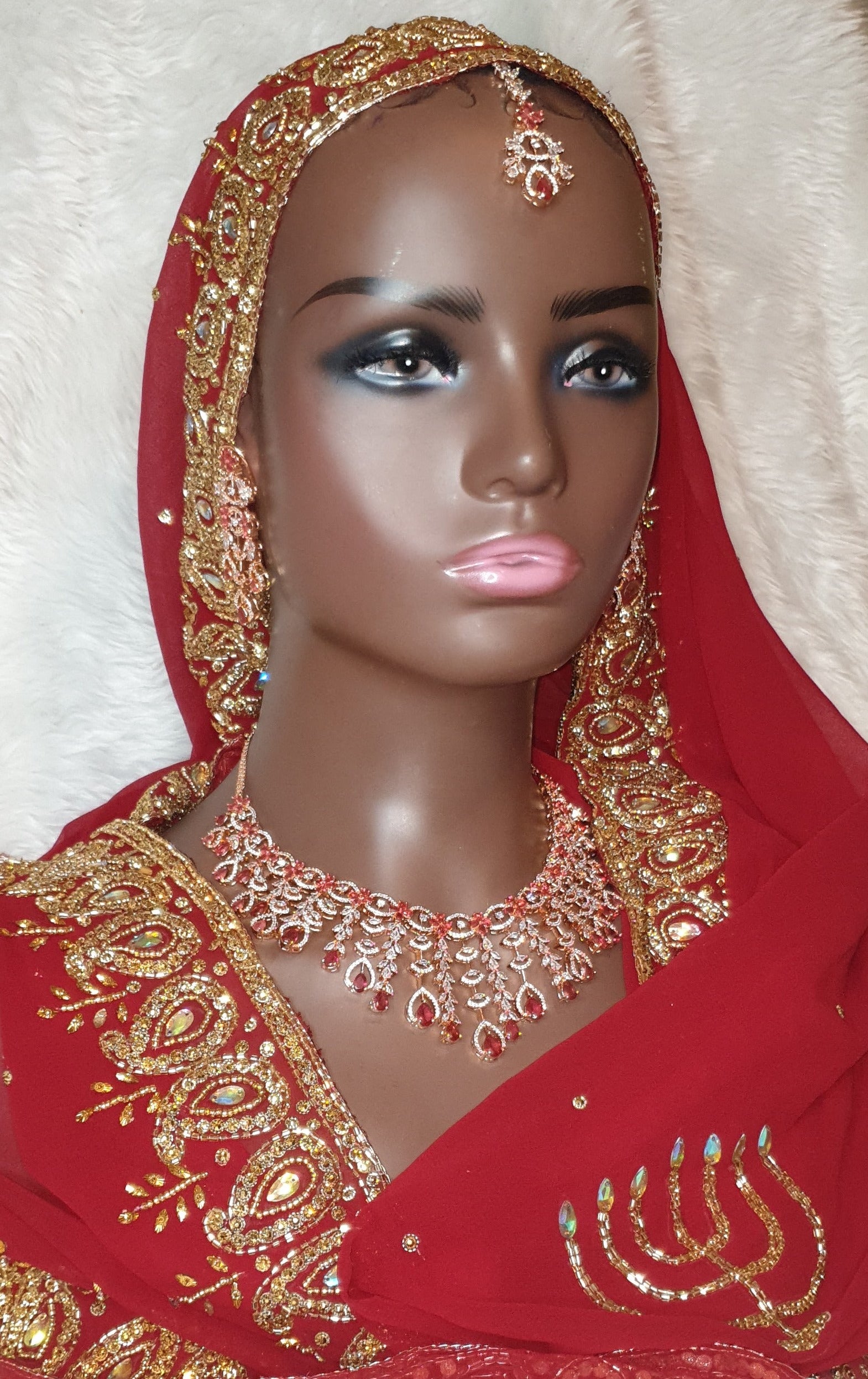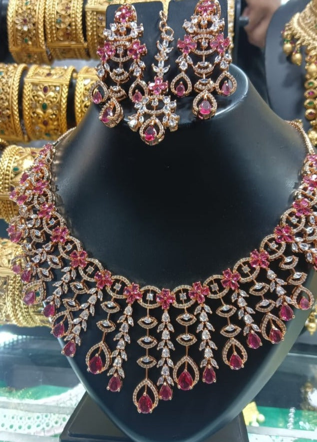 Elevate any outfit with our Rose Gold Choker Set, adorned with maroon stones. This set adds a touch of elegance and sophistication to any look. Perfect for any occasion, this versatile piece is a must-have in your jewelry collection.This piece is an elegant unique and eye catching piece befitting any princess.