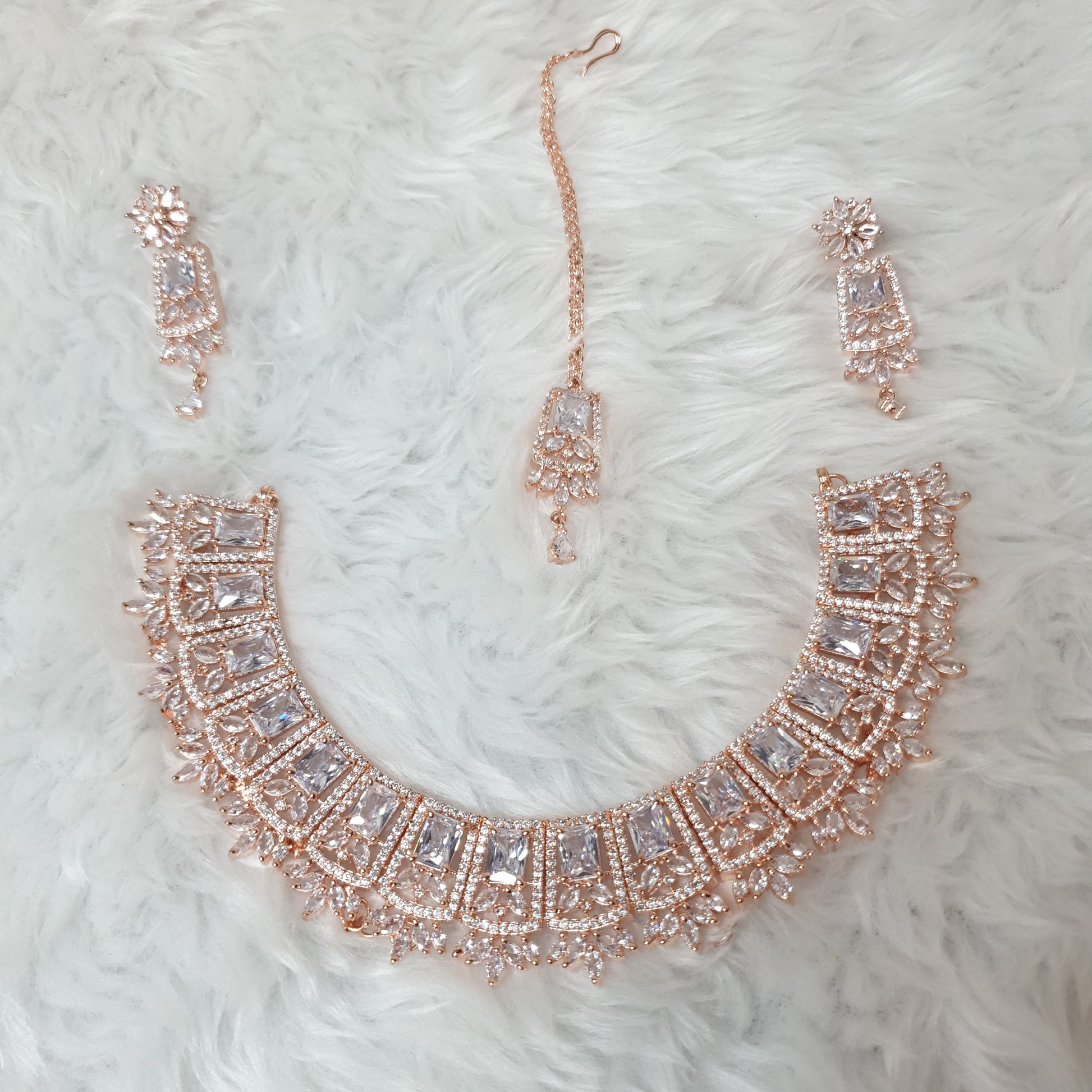 Elevate any outfit with our Rose Gold Choker Set, adorned with stunning crystal . This set adds a touch of elegance and sophistication to any look. Perfect for any occasion, this versatile piece is a must-have in your jewelry collection.This piece is an elegant unique and eye catching piece befitting any princess.