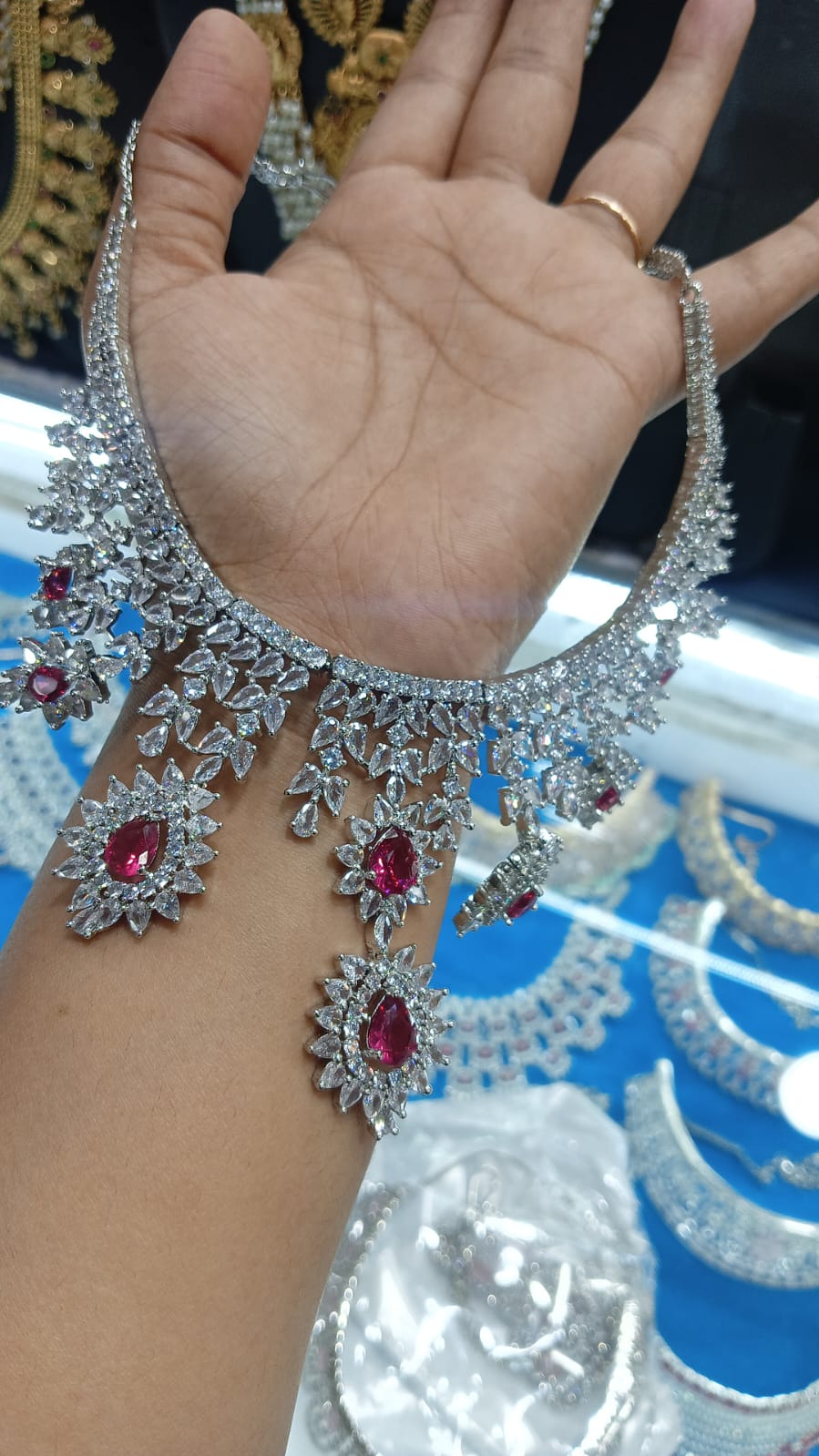 Elevate any outfit with our Silver necklace Set, adorned with stunning emerald green stones. This set adds a touch of elegance and sophistication to any look. Perfect for any occasion, this versatile piece is a must-have in your jewelry collection.This piece is an elegant unique and eye catching piece befitting any princess.
