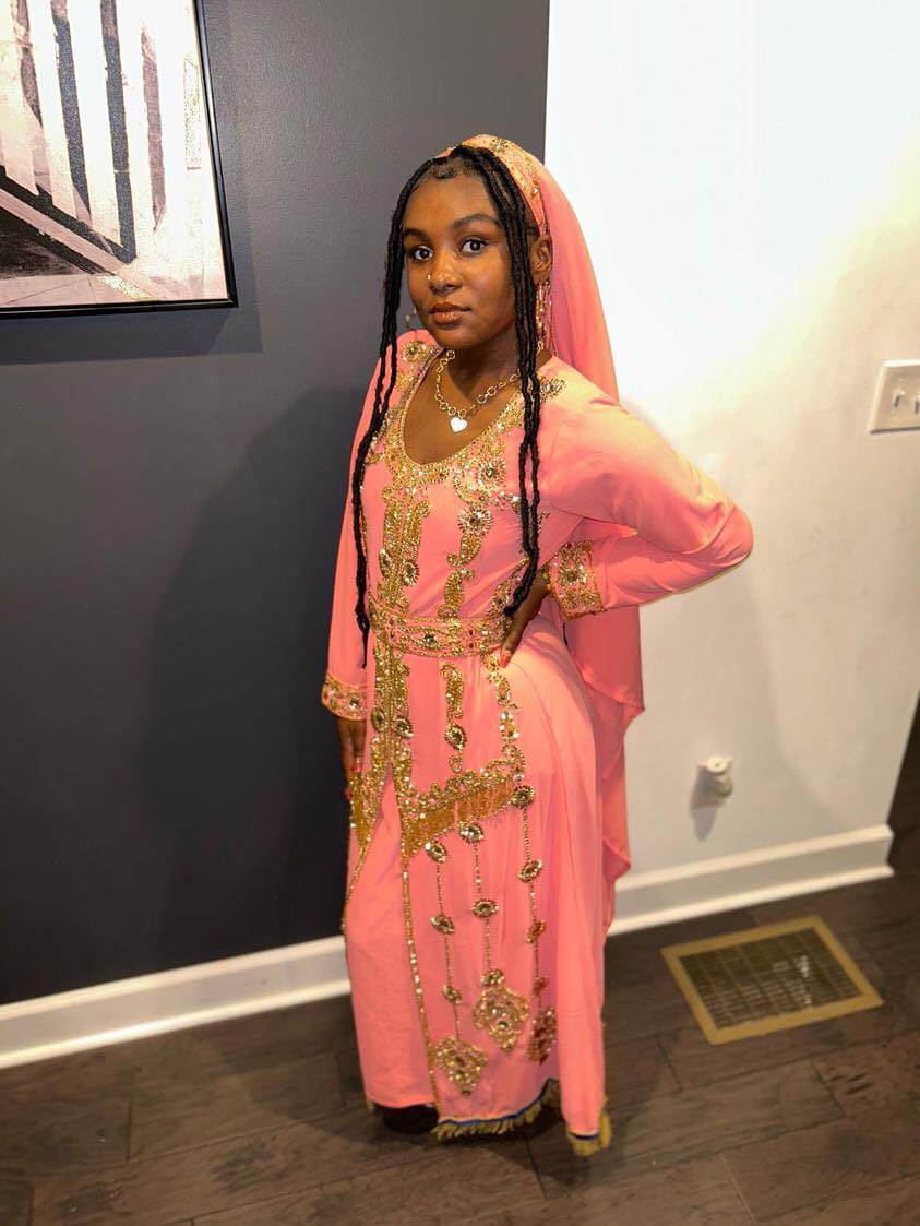 This regal two-piece, featuring sparkling golden tassels and a dazzling diamond headwrap, will make any event unforgettable!.