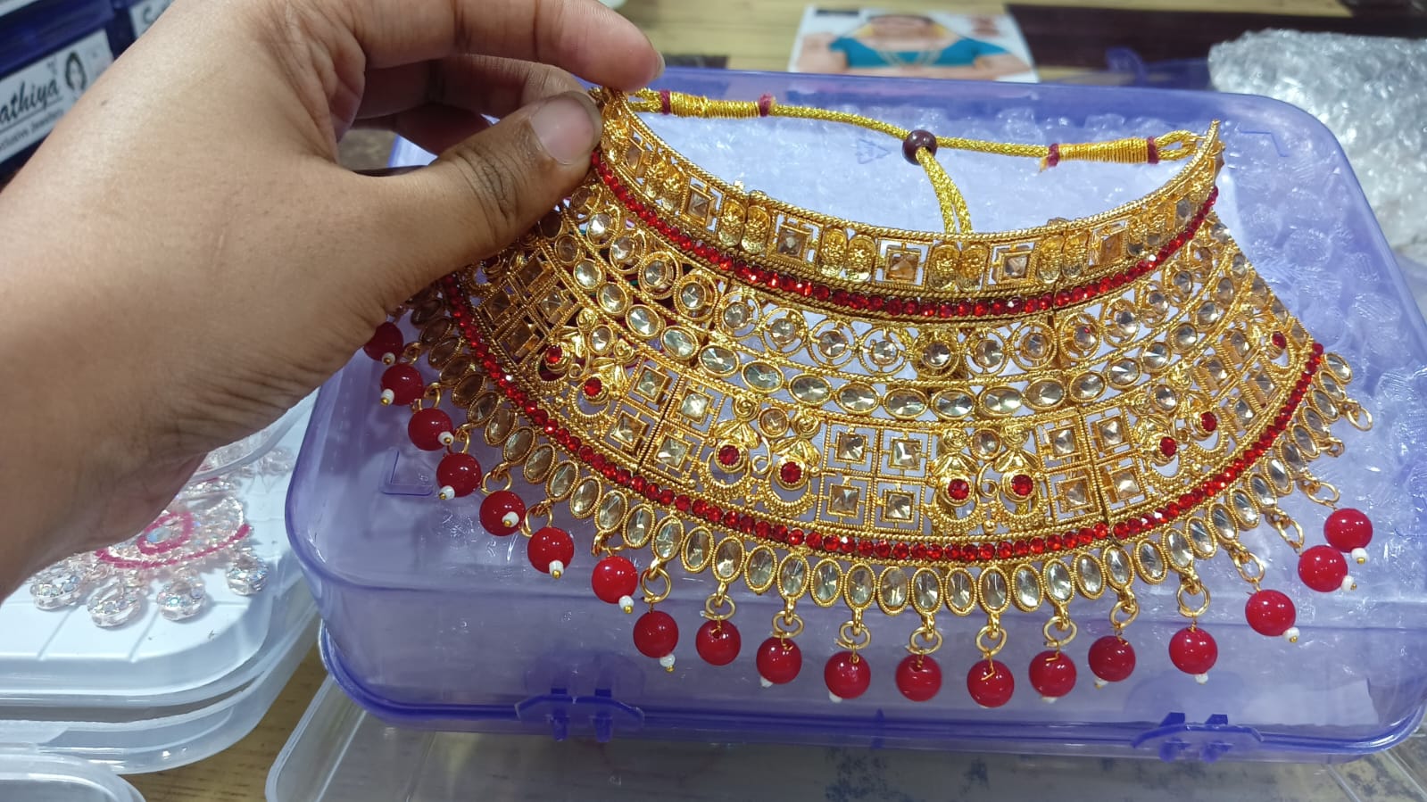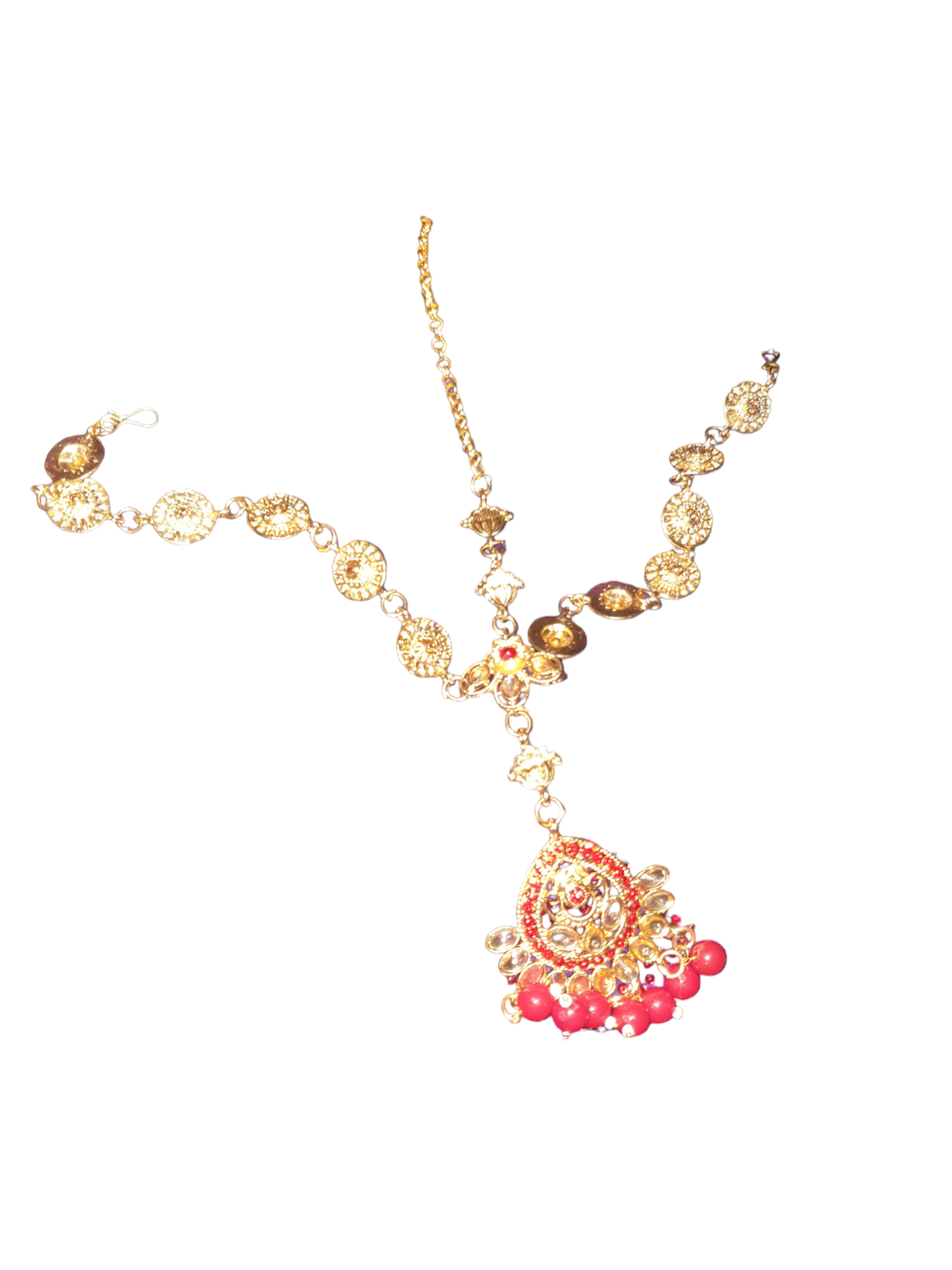 Elevate any outfit with our Gold Choker Set, adorned with stunning red stones. This set adds a touch of elegance and sophistication to any look. Perfect for any occasion, this versatile piece is a must-have in your jewelry collection.This piece is an elegant unique and eye catching piece befitting any princess.