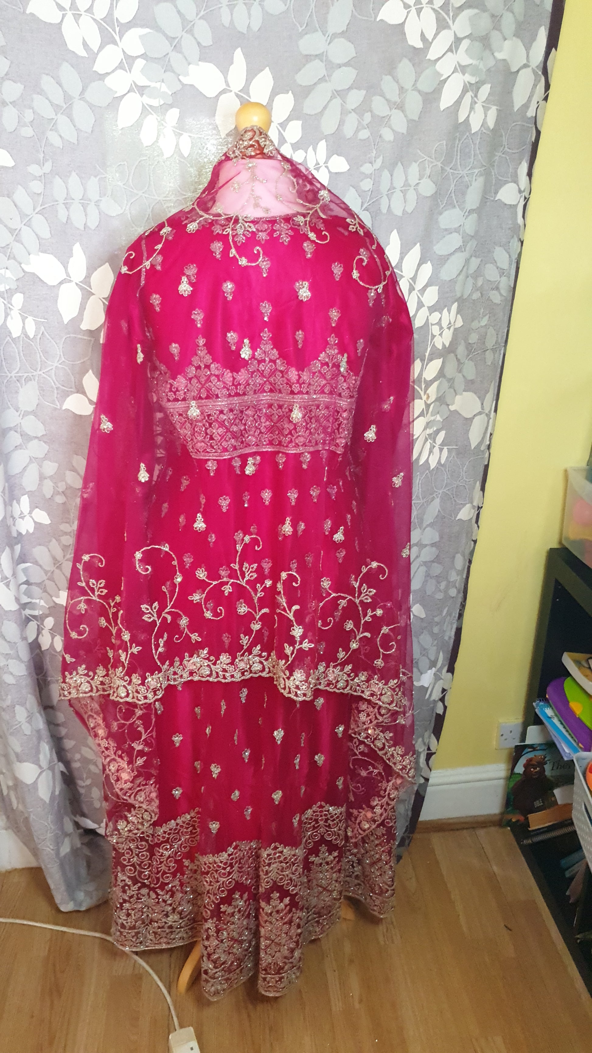 Magenta 2pc dress come with veil/headwrap. This dress is hand embroidered With ready lined petticoat.
