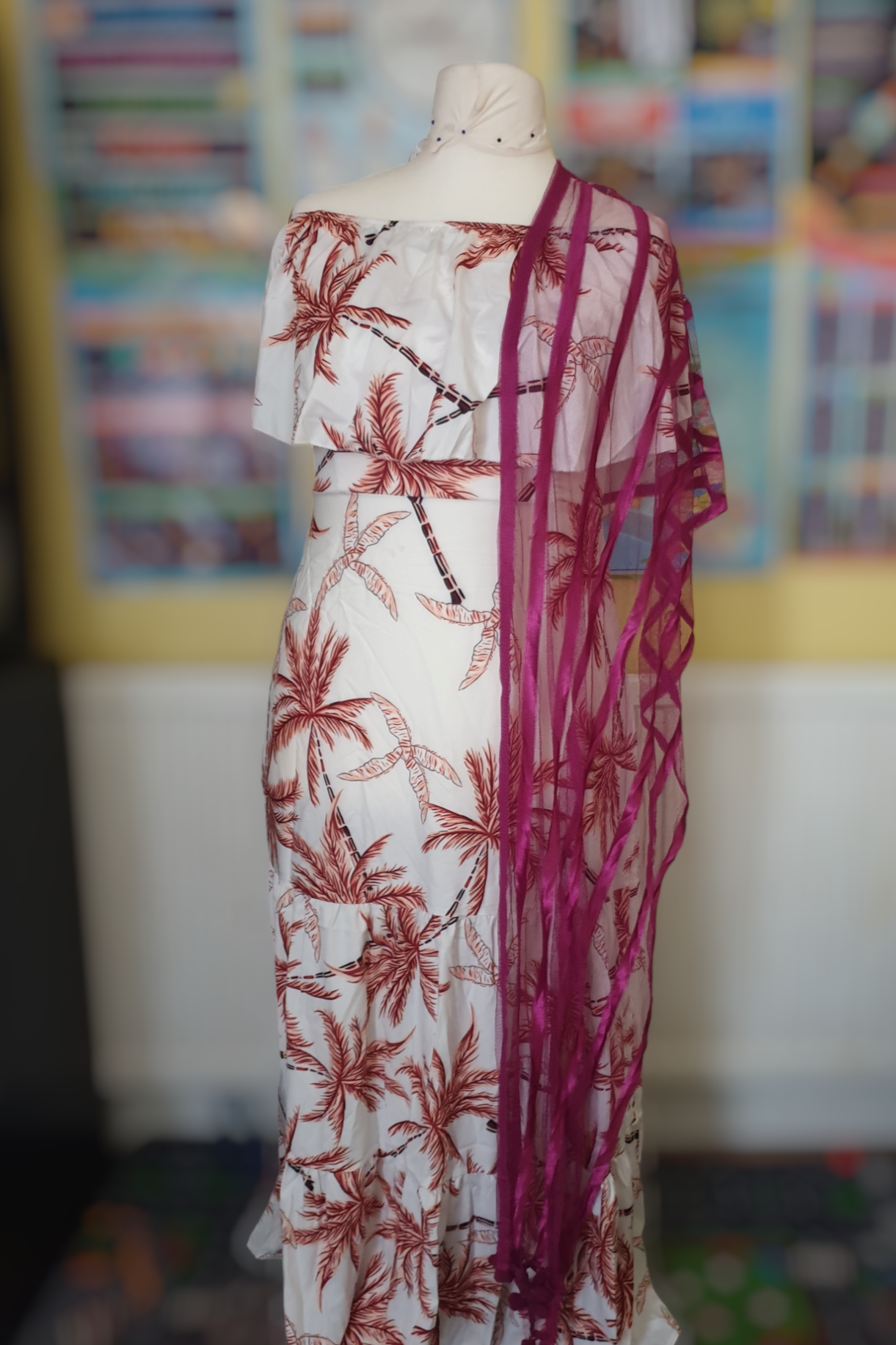 This is a sheer 100% Polyester fabric wrap . This is super light and has a great stretch light so very easy to work with as a headwrap. Both short edges has tassles