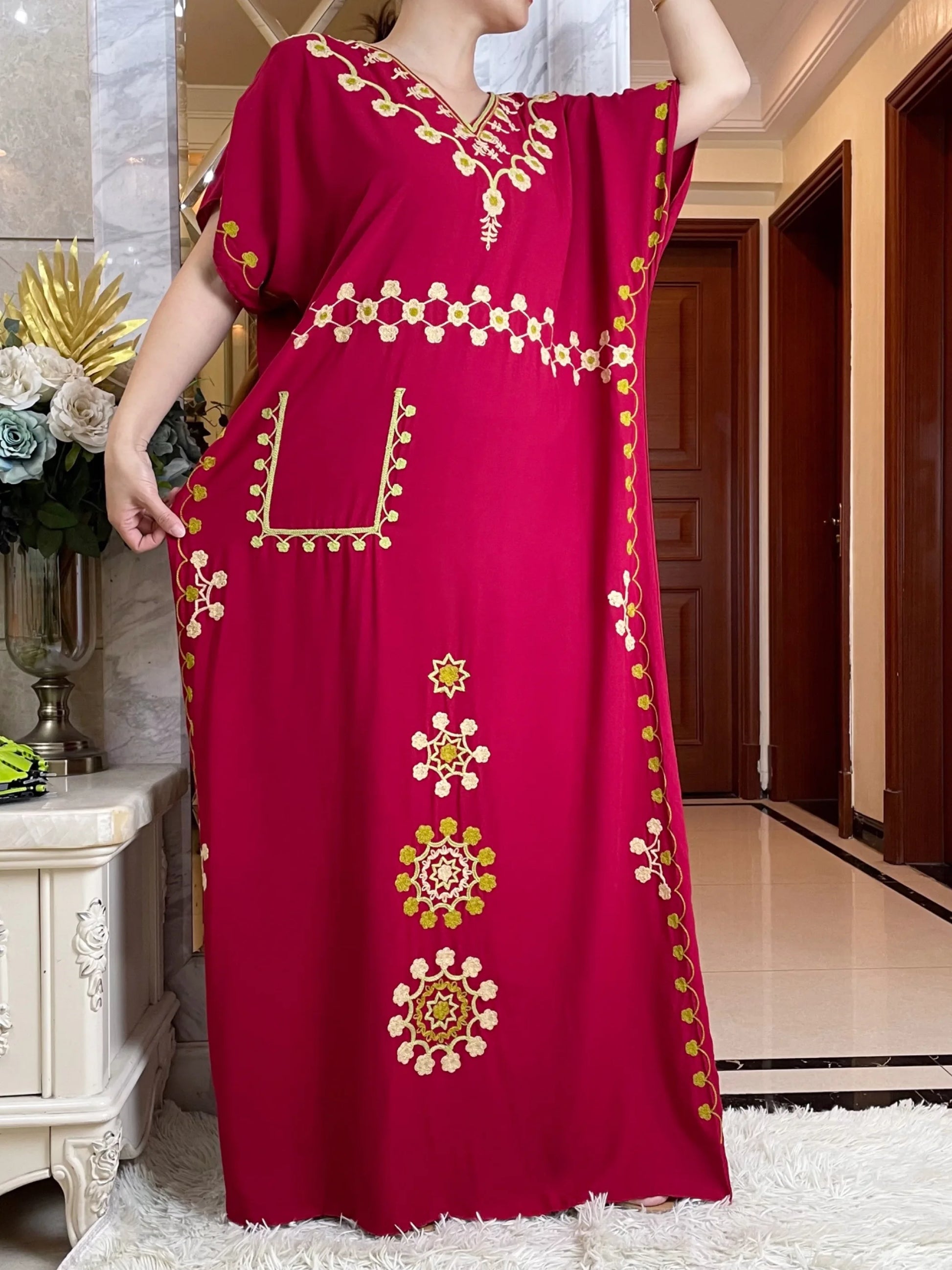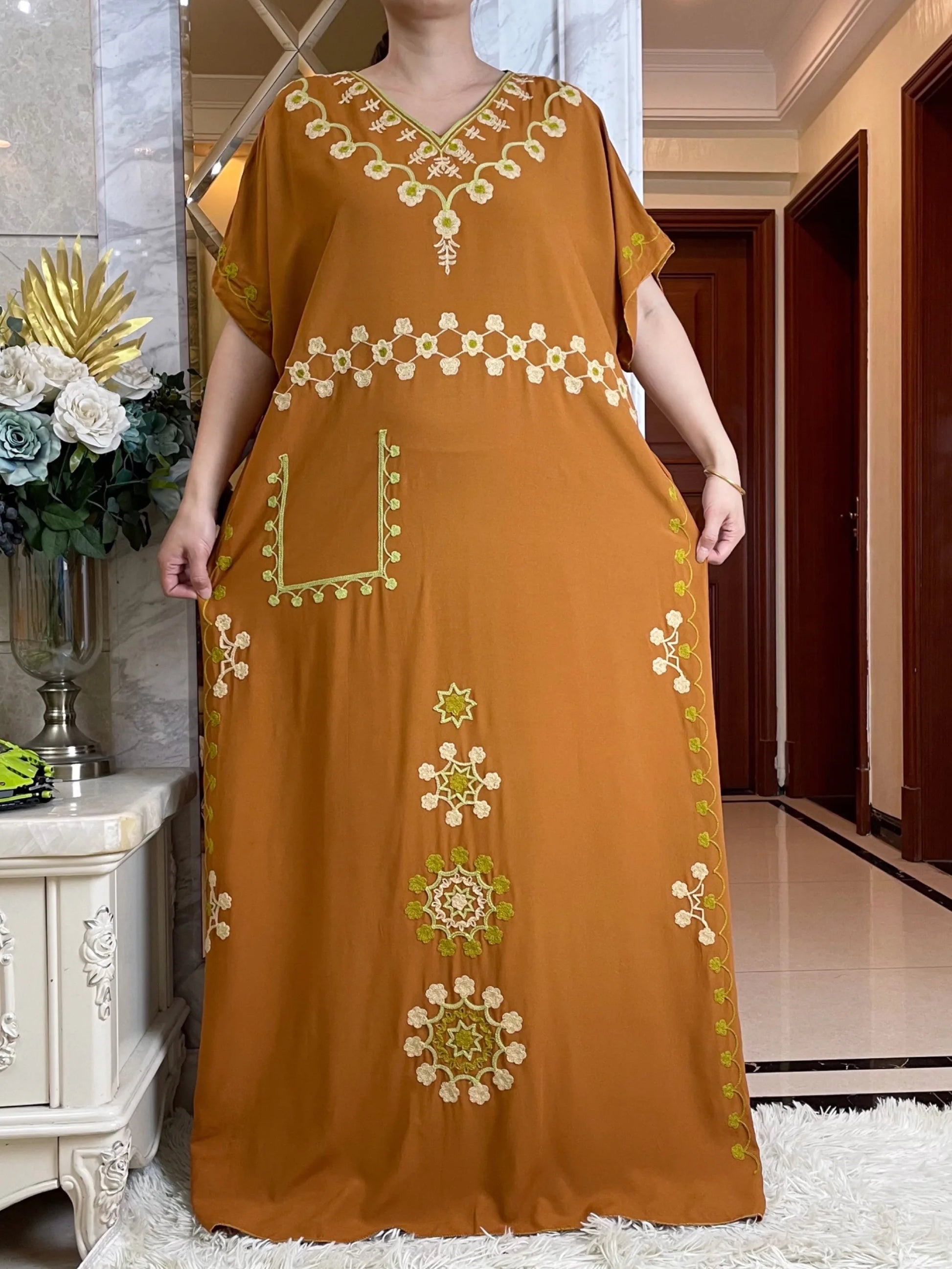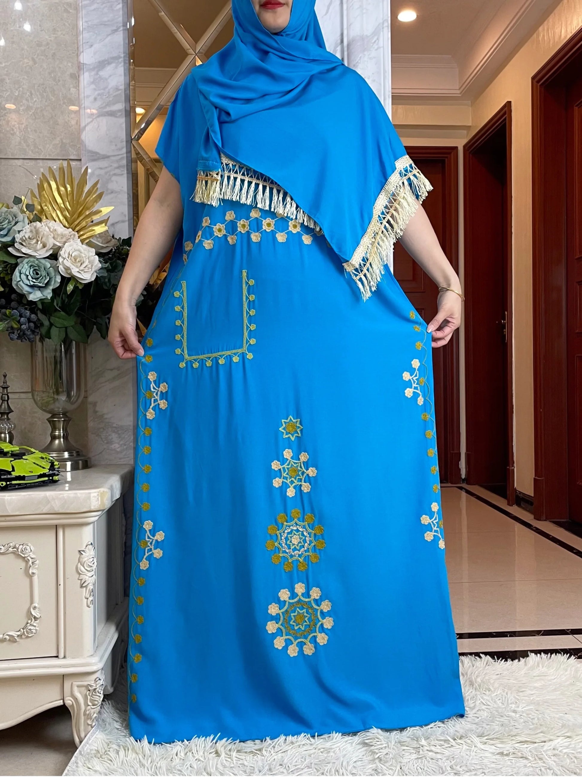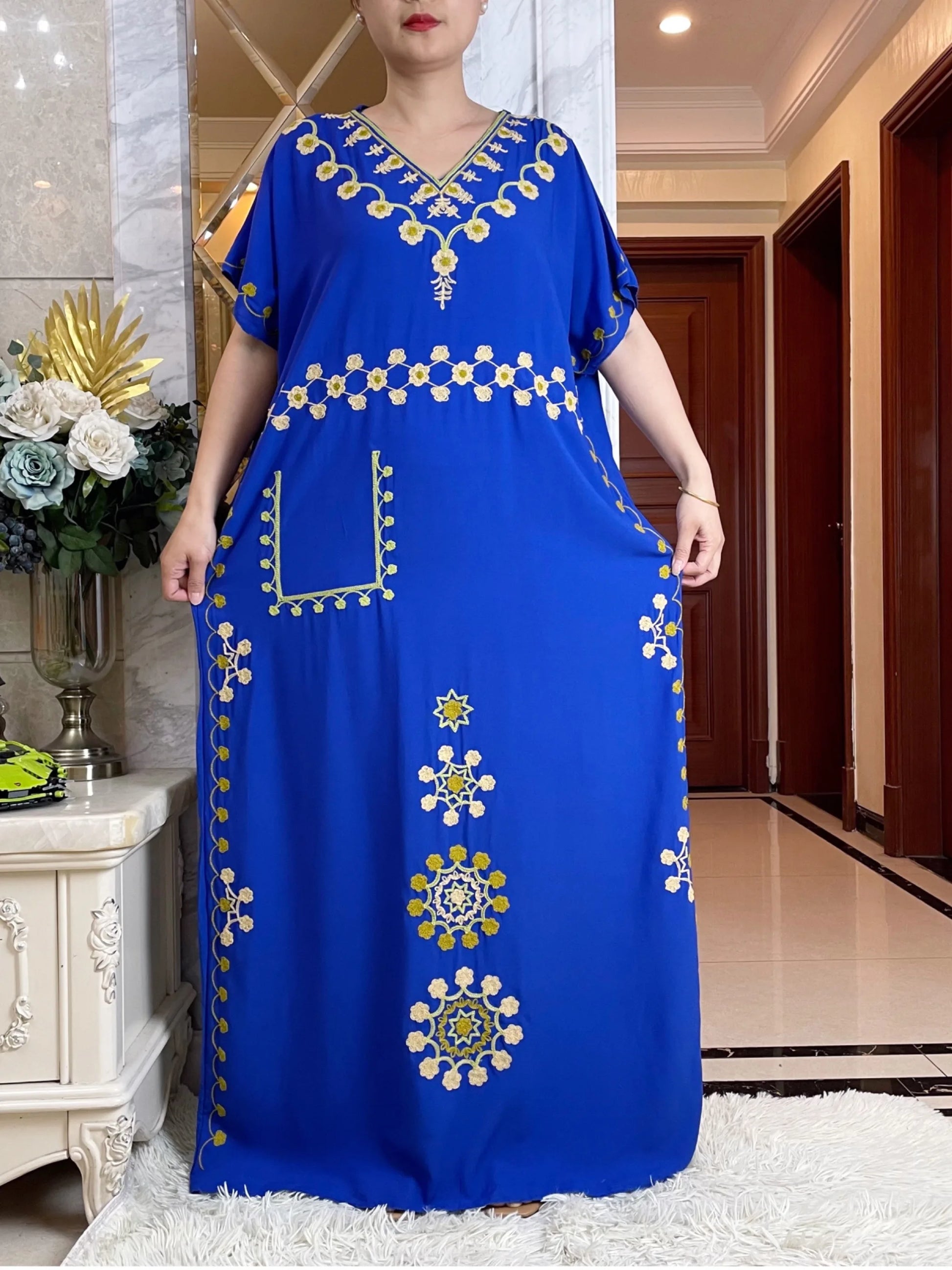 V-neck Abaya Summer Short Sleeve Loose Cotton Dress With Big Scarf